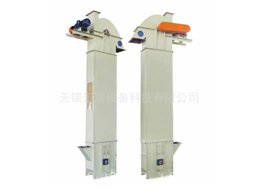 该机主要由壳体、牵引件(输送链)、料斗、驱动轮(头轮)、改向轮(尾轮)、张紧装置、导向装置、加料口(入料口)和卸料口(出料口)。料斗把物料从下面的储藏槽中舀起,随着输送带或链提升到顶部,绕过顶轮后向下翻转,将物料倾入接受槽内。带传动的斗式提升机的传动带一般采用橡胶带,装在下或上面的传动滚筒和上下面的改向滚筒上。链传动的斗式提升机一般装有两条平行的传动链,上或下面有一对传动链轮,下或上面是一对改向链轮。斗式提升机一般都装有机壳,以防止斗式提升机中粉尘飞扬。