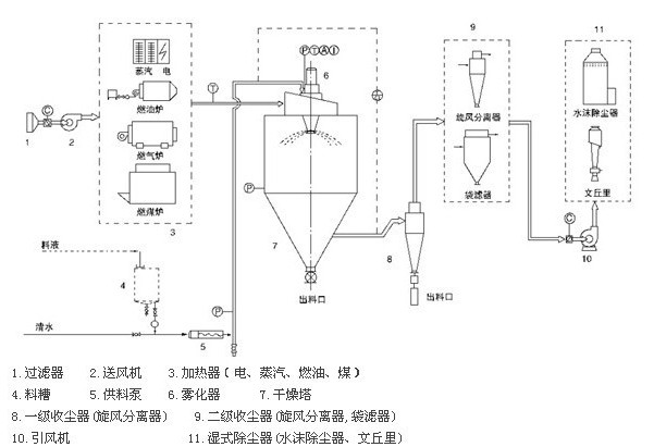 空气通过过滤器和加热器,进入干燥器顶部的空气分配器,热空气呈螺旋状均匀进入干燥器。料液由料液槽经过滤器由泵送至干燥器的离心雾化器,使料液喷成绩效的雾状液滴,料液和热空气并流接触水分迅速蒸发,在短时间内干燥为粉末状成品。成品由于干燥塔地步和旋风分离器排除,废弃由风机排出。