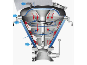 VC混合机由摆线减速机连接中心螺杆及外层螺带以相同转速运转。工作时中心螺杆将混合物料由底部提升到顶部,同时线速度较大的外部螺带将物料由下向上沿锥形桶壁盘提升,两种运动在离心力作用下又将物料沿切线方向抛向空间,物料产生强烈的对流剪切、扩散,从而达到快速混合的目的(中心螺杆也可做成反向螺杆)。